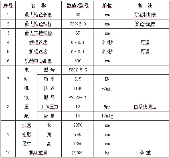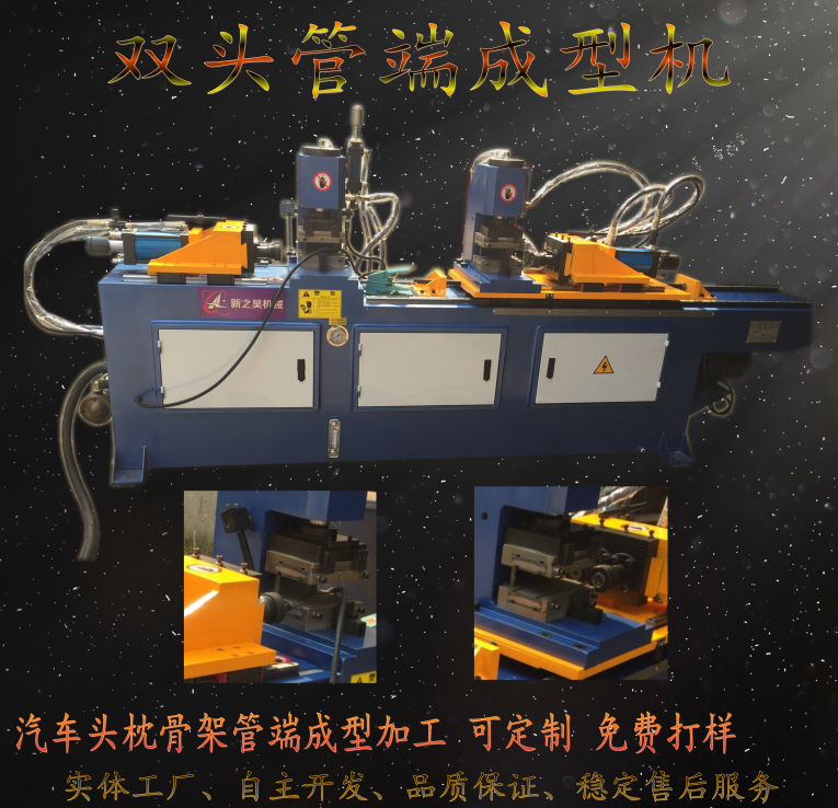 1.本機針對于汽車頭枕骨架管端縮口成型加工研發(fā),采用雙管雙頭同時加工、一次成型、效率非常高,由于采用雙頭成型、大大改善了單頭成型管件同心度問題。